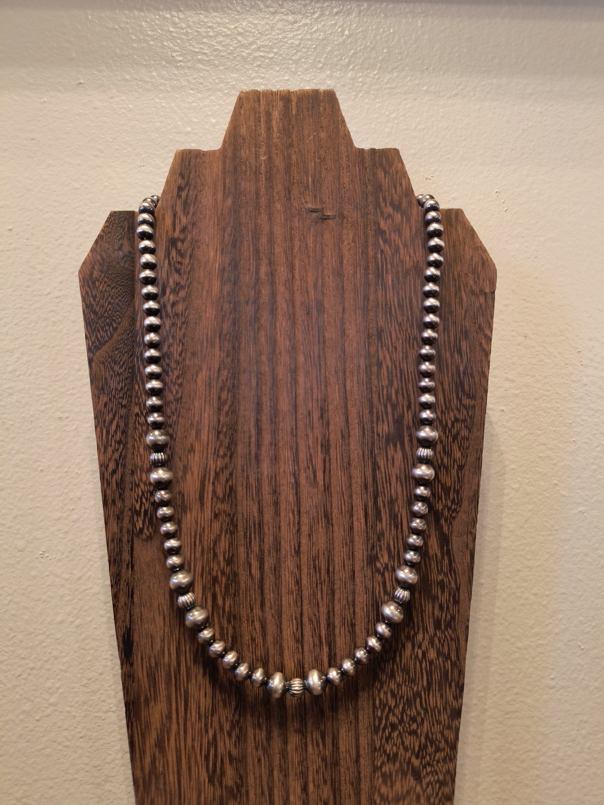 The Savannah Necklace is a 20" necklace made of 6 and 8mm Original Navajo Pearls and 6mm corrugated pearls.
